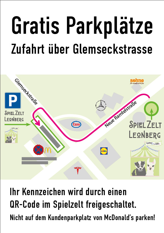 - Parkplatz: Informiert Euch über die zusätzlichen Parkplätze in der Nähe zwischen Esso und McDonalds