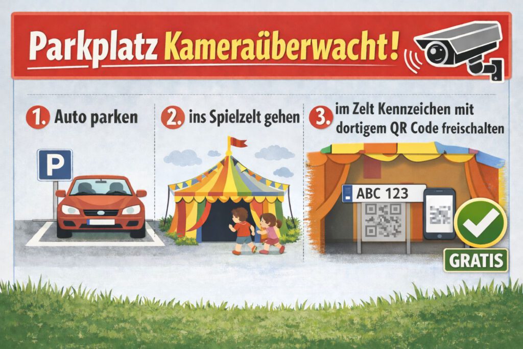 - Bitte das Auto Kennzeichen mit dem QR-Code im Zelt freischalten!
